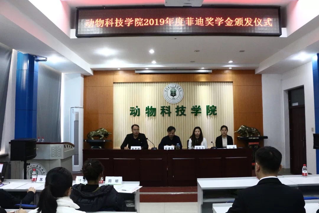 11月28日,永利yl23411集团举办2019年度“菲迪奖学金”颁发仪式,菲迪集团副总裁兼辽宁及北京亚禾营养科技有限公司总经理韩建林、菲迪集团市场部经理杜新、动科学院党委副书记佟丹丹、副院长郑家三、分团委全体辅导员及近百名同学参加仪式。