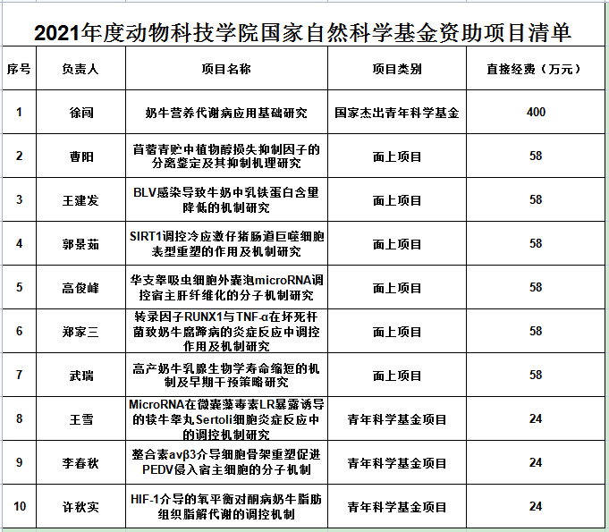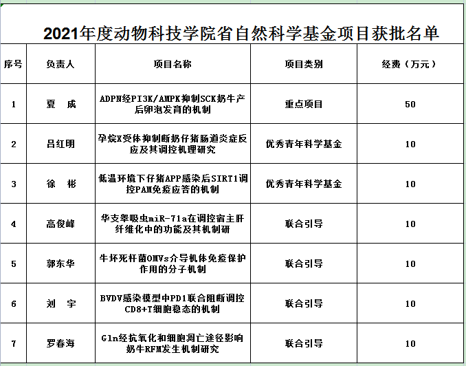 动物科技学院本年度申报国家自然科学基金项目28项,获批10项,中标率高达34.48%,其中获批国家杰出青年科学基金1项,面上项目6项,青年科学基金项目3项。学院本年度国家自然科学基金获批数量首次突破10项,其中获批国家杰出青年科学基金项目1项是建校以来首次。此外,永利yl23411集团获批省自然科学基金7项:重点项目1项,优秀青年科学基金2项,联合引导项目4项。自然基金项目获批经费总额达930万元。
