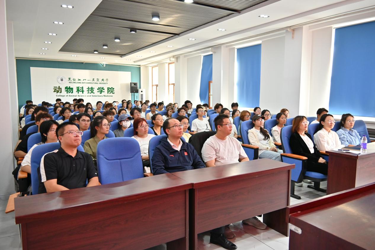宣讲中,崔英春围绕四个部分展开。第一部分“跨越一甲子时光赴精神邀约”。通过展示其父亲、我院牧医64级校友崔连生的学生证、毕业证书等珍贵资料,将同学们的思绪拉回数十年前,开启了对北大荒精神传承历程的追溯。第二部分“两个‘红色基因’滋养黑土地”,深入解读了“草原红”北大荒精神与“石油红”大庆精神铁人精神。北大荒精神蕴含自立更生、艰苦创业、勇于开拓、甘于奉献的内核:开发者们在不同时期为国家粮食安全作出重要贡献,数十万开发者扎根荒原,奉献青春与终身。大庆精神铁人精神则以爱国、创业、求实、奉献为核心,从铁人王进喜“宁肯少活二十年,拼命也要拿下大油田”,到“新时期铁人”王启民“宁肯把心血熬干,也要让油田高产再稳产”,再到“新铁人”李新民“宁肯历尽千难万险,也要为祖国献石油”,一代代石油人用行动诠释着这一精神。第三部分“代代学子续写‘大地论文’”,聚焦红色草原牧场的发展成果与先辈们的奉献故事。讲述了黄国卿、季长青、崔连生等先辈的事迹。黄国卿背着药箱走遍草原防控疫病,崔连生为解决奶牛乳房炎问题放弃晋升机会,不顾风险投身一线,在严寒中坚守岗位,确保主持兽医工作期间无大牲畜病死及大规模传染性疫病发生,他们用专业与坚守在黑土地上书写着责任与担当。第四部分“一份精神赓续使命作答新卷”,崔英春倡导大家致敬前辈、传承精神,秉持“用脚、用心、用生命,把论文写在大地上”的理念。她分享了其父亲1968年毕业之际所作的自勉诗“俗云烈火炼真金,炉温越高金越纯。我愿投身炉中去,誓与真金比纯真”,并引用“幸福都是奋斗出来的,奋斗,是青春最亮丽的底色”,激励同学们以青春之力践行北大荒精神,在新时代续写使命答卷。